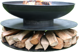 Круглому вогнищу з металу додає практичності полиця для дров. Дрова для розпалювання багаття завжди будуть «під рукою», захищені від дощу і снігу. Крім того, ще й будуть підсихати під час експлуатації вогнища.